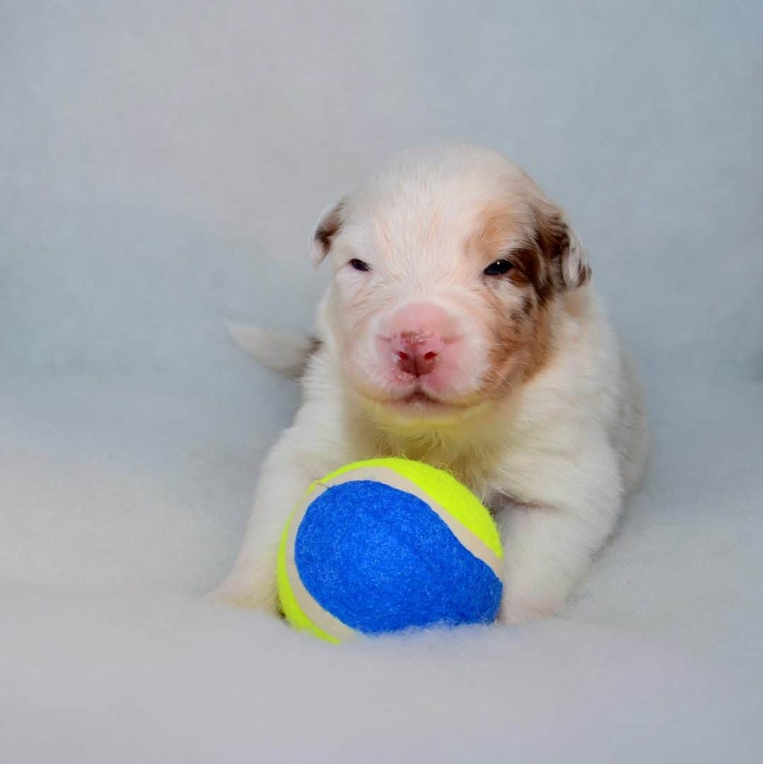 Pup 7, de bijzondere pup, een kant merle koppie, andere kant wit