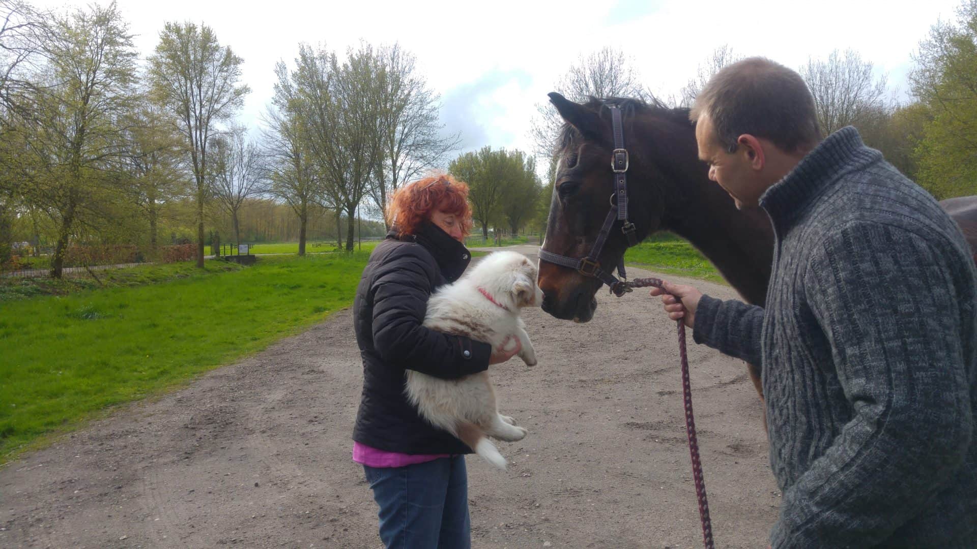 Na een wandeling kwamen we mensen met een paard tegen, de eigenaren werkten mee om de pups te socialiseren